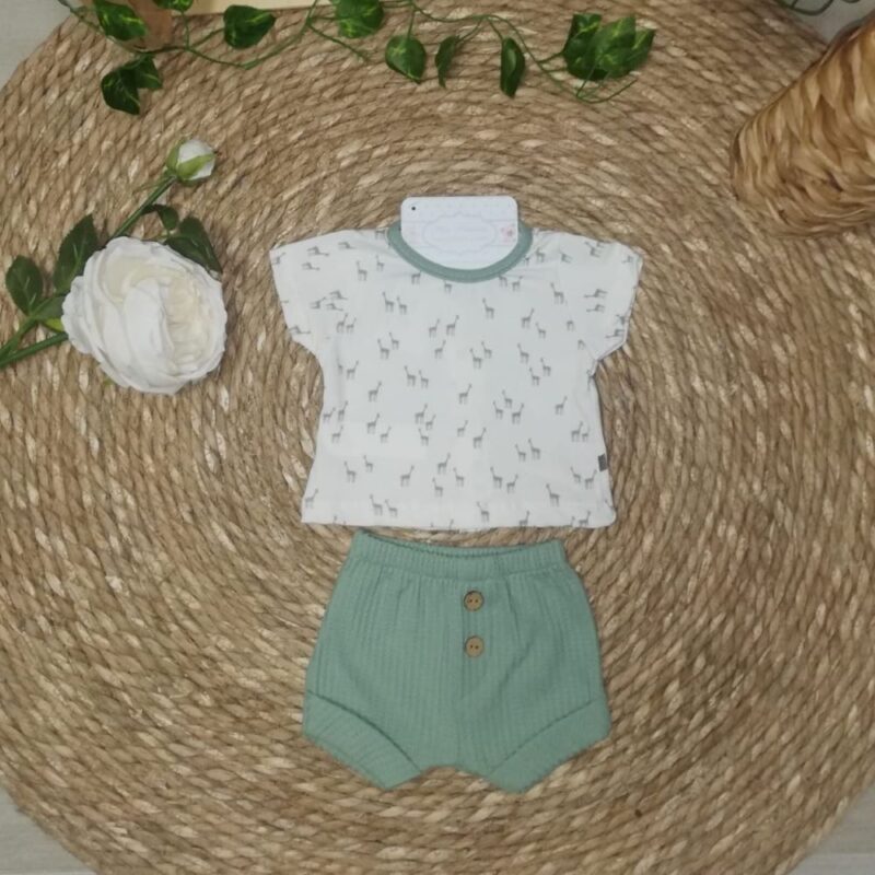 Conjunto de 2 piezas, camiseta de estampado de jirafas y ranita en verde.