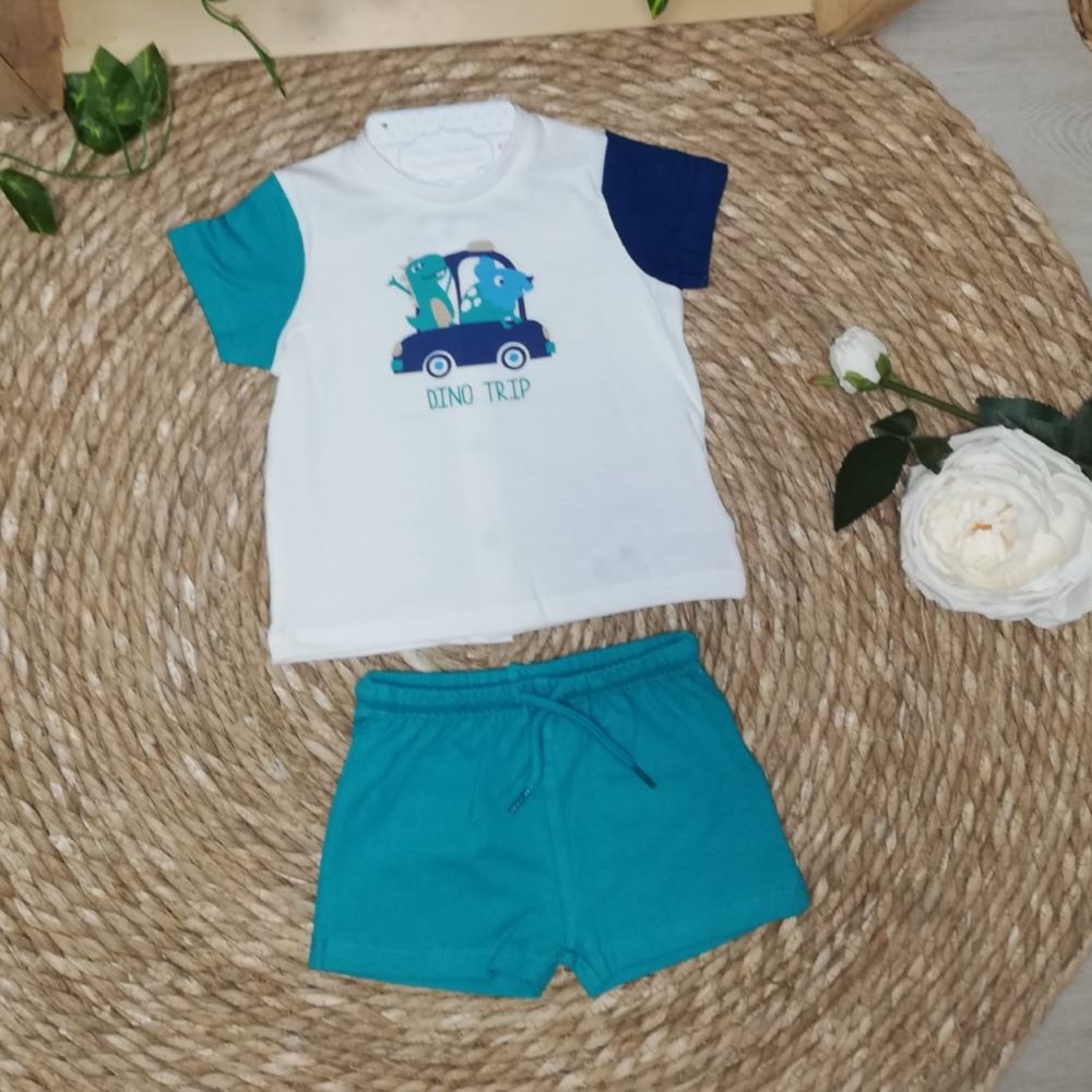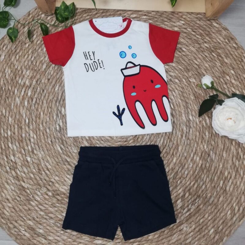Conjunto de camiseta y pantalón en tonos marino, rojo y blanco